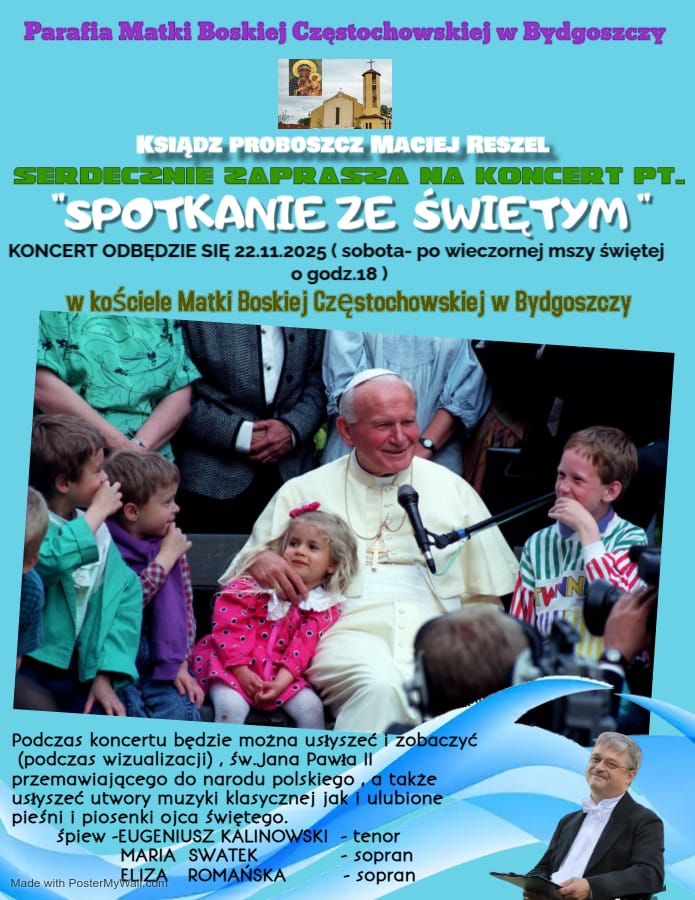 Niedziela 27.10.2024r godz. 18.00 W niedzielę 27 października podczas Mszy Świętej o godz. 18.00 zaśpiewa bydgoski…